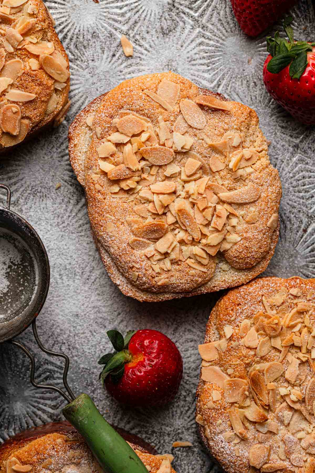 - Use thick slices of Brioche, 3/4-1 inch thick. This is a hearty pastry and needs a solid structure to carry the almond cream and baked twice.