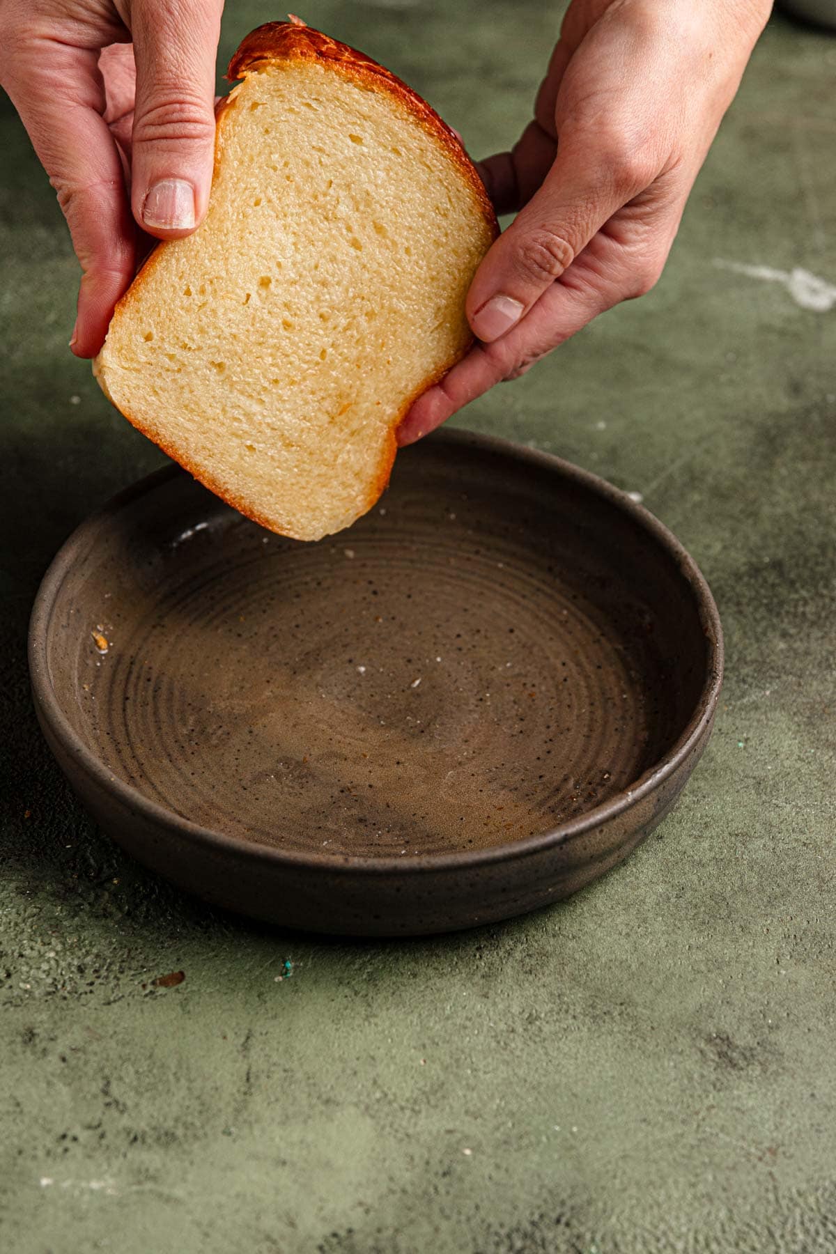 - Dip the bread on both sides, to maintain the moist texture and not dry out during baking. I like to hold each slice vertically over the bowl, and ever so gently squeeze the slice to remove access syrup.