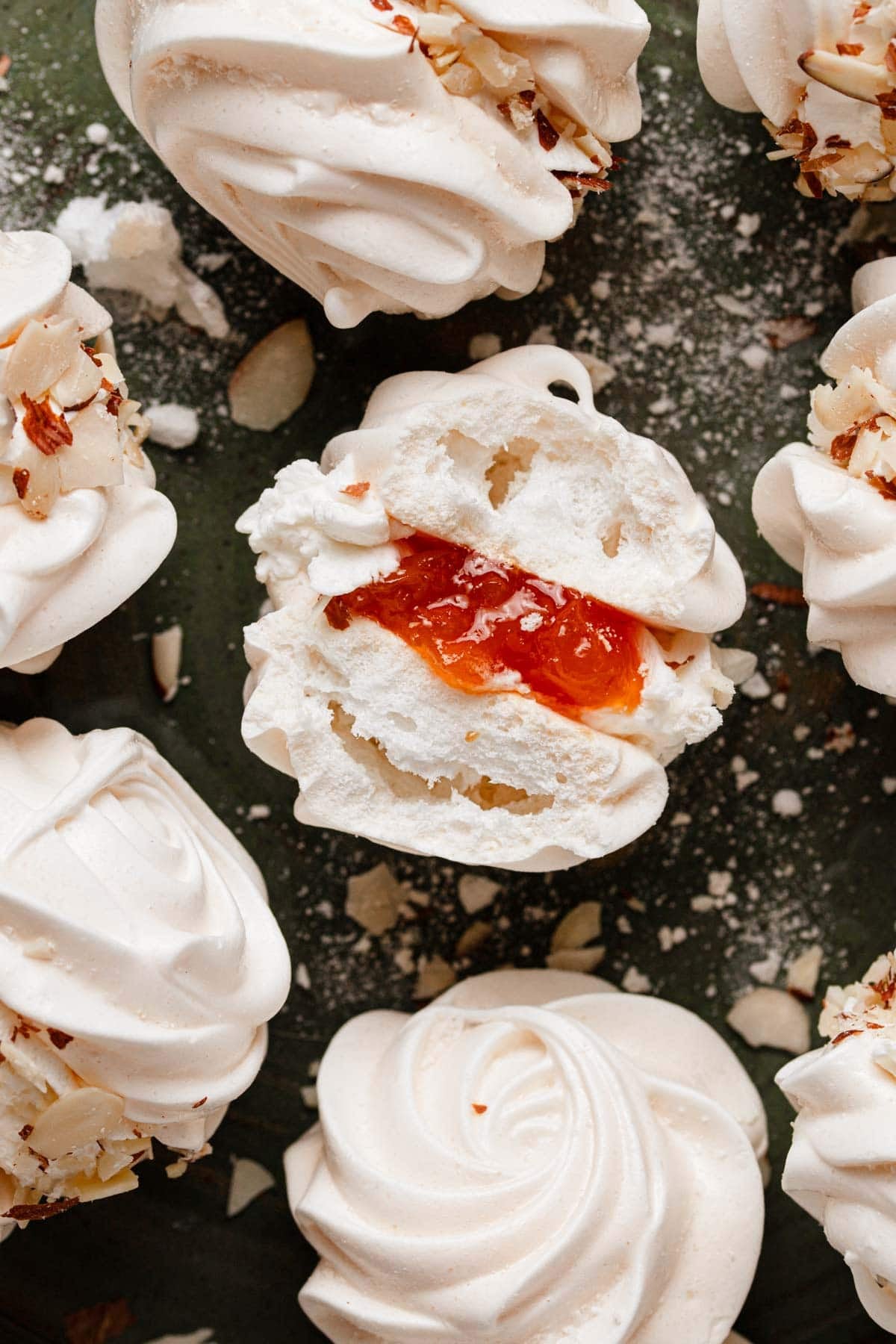Two crispy, light, and airy almond meringue cookies, filled with whipped cream and a dollop of orange marmalade, then rolled in toasted sliced almonds. Every bite is a symphony of brittle and creamy textures, with a perfect balance of nutty, sweet and tart flavors.