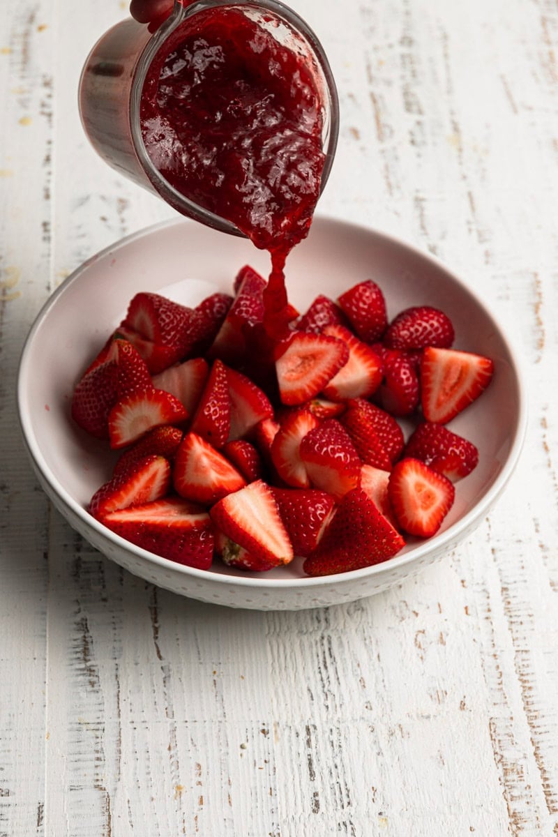 - Warm the strawberry preserves over medium heat in a medium sauce pan, then pour the warm liquid over the cut strawberries.