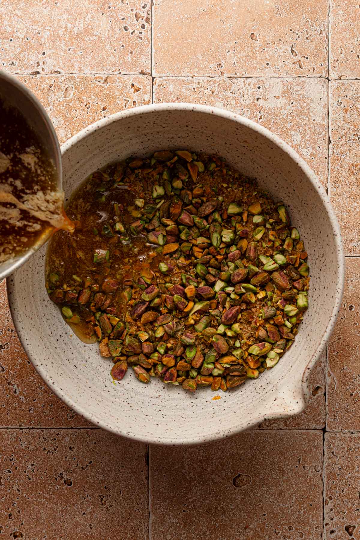 - Pour the honey mixture over the sugar-pistachio mixture and mix until fully incodporated.