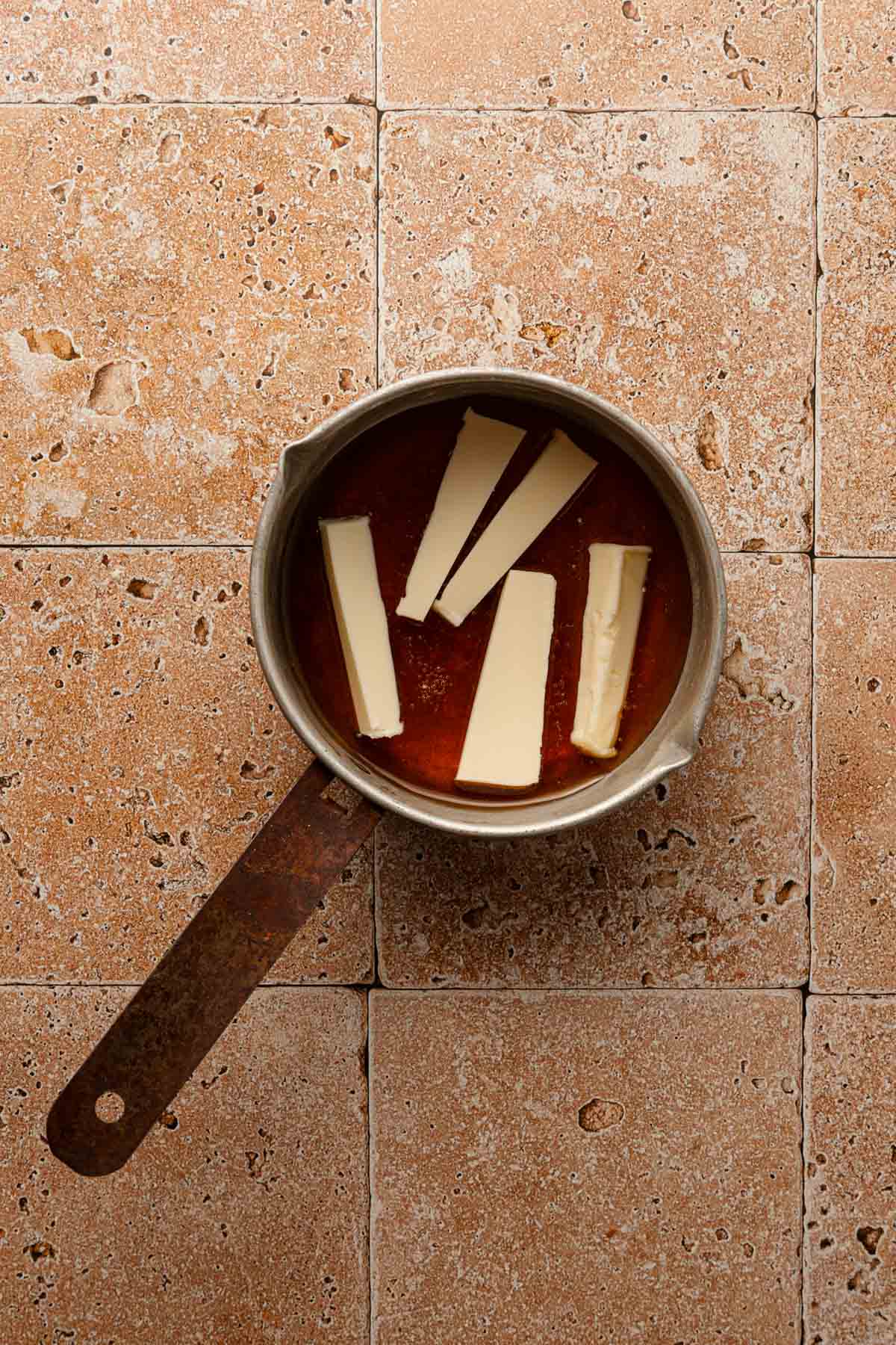 - Pour the honey and butter into a small sauce pan and warm over the stove, until the butter is completely melted.