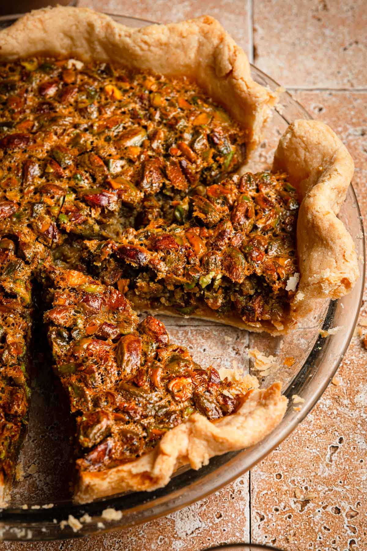 A Southern-style pistachio pie is made of a rich, buttery custard filling sweetened with honey and brightened with orange zest and orange liqueur, creating a gooey, caramel-like center with a soft custard texture and a crunchy toasted-pistachio top, all baked in a flaky crust for a nutty twist on the classic pecan pie.