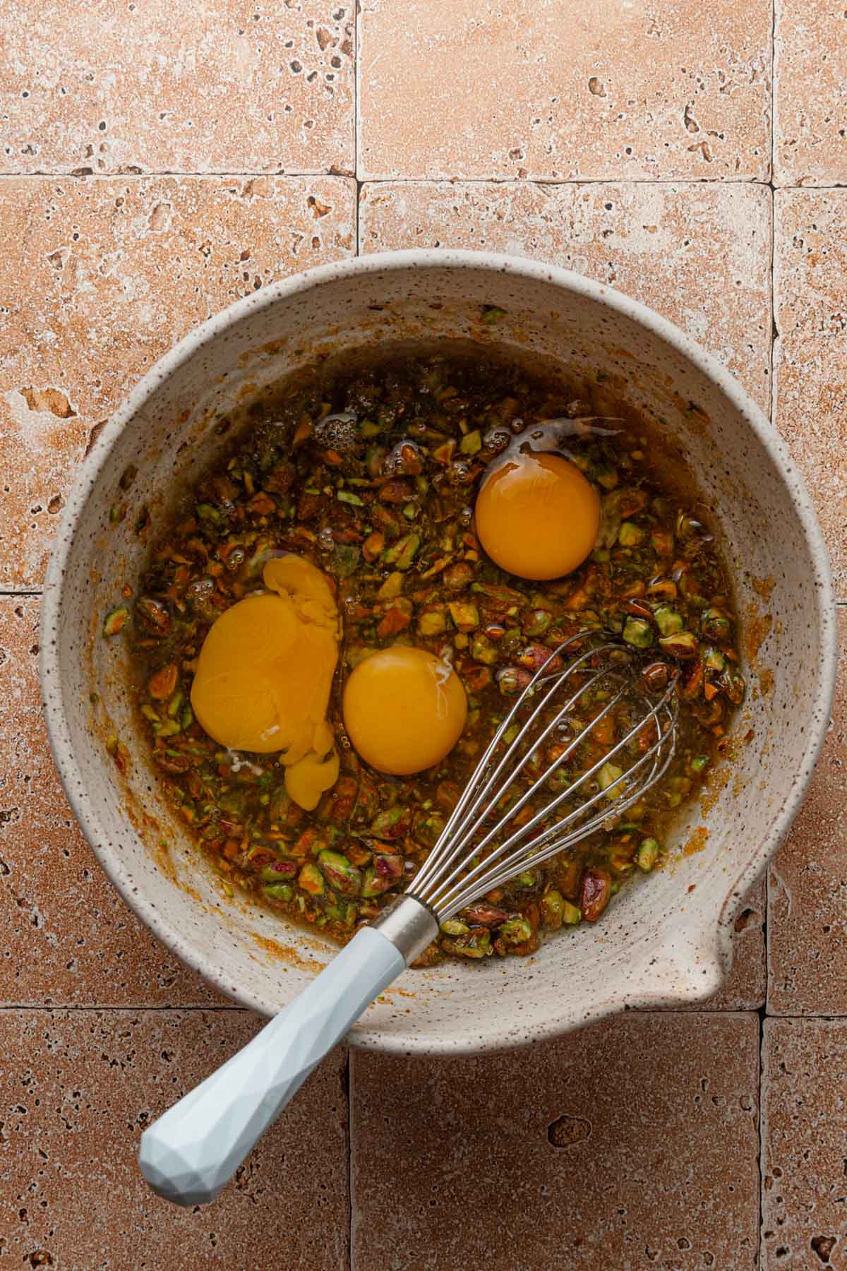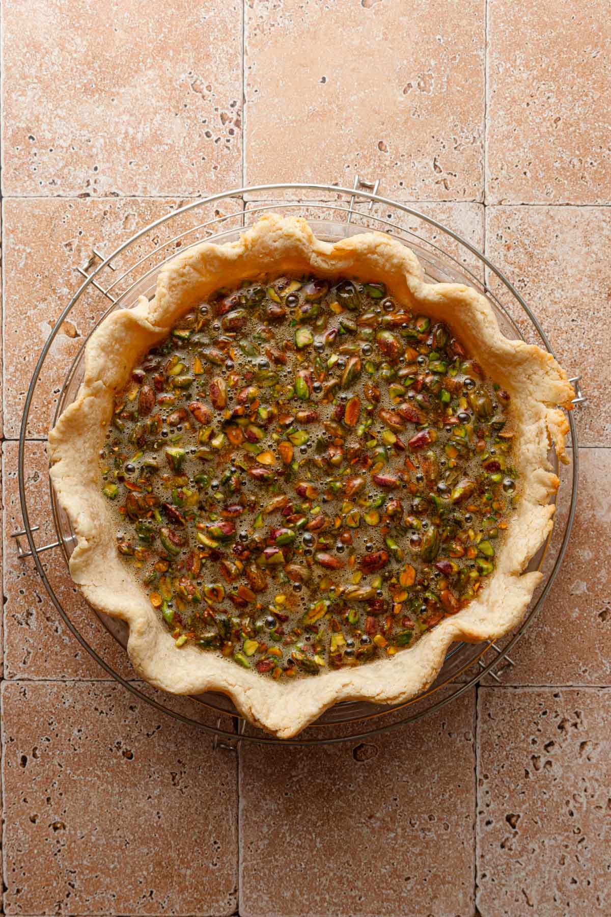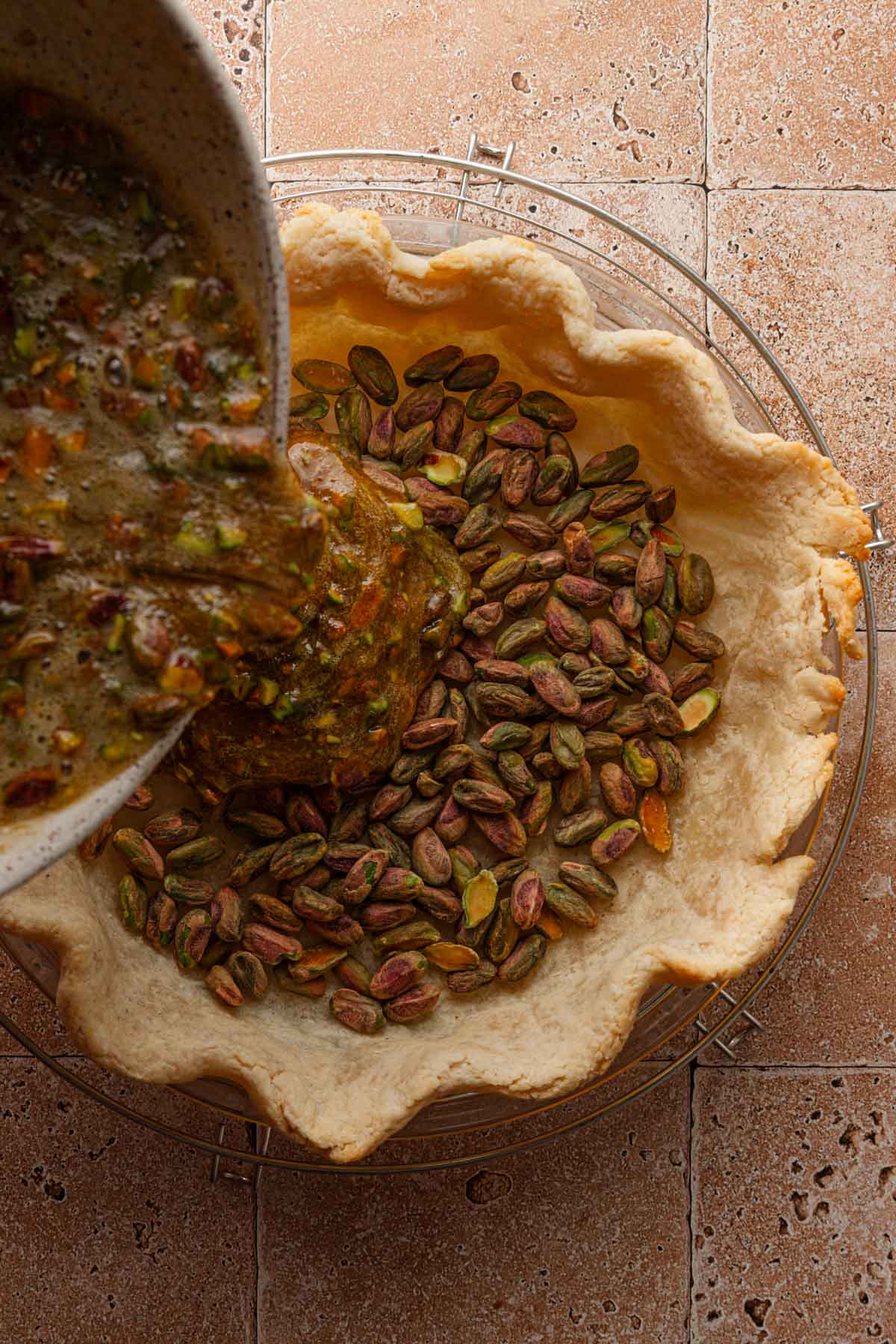 - Top the par-baked pie crust with the whole pistachios, then pour the liquid mixture over the pistachios into the crust.