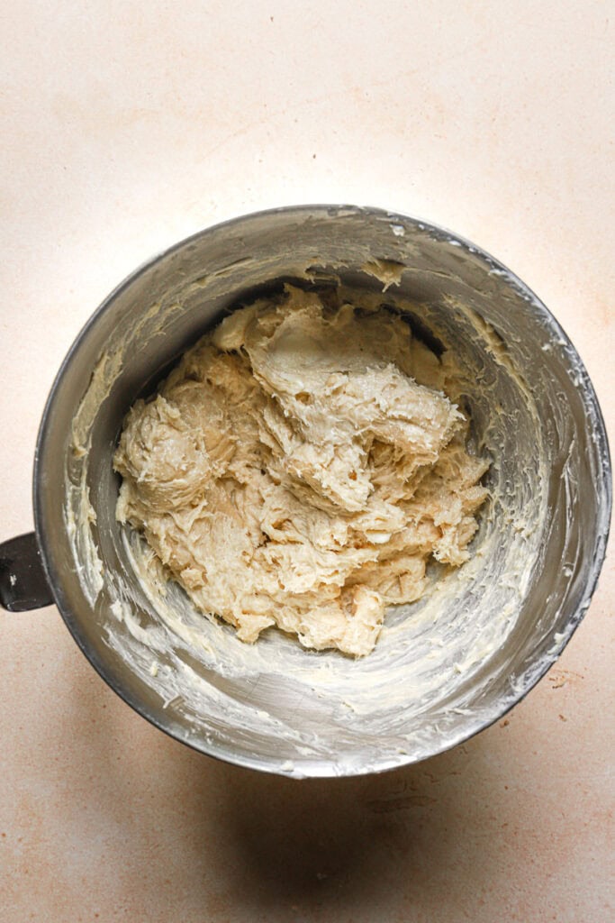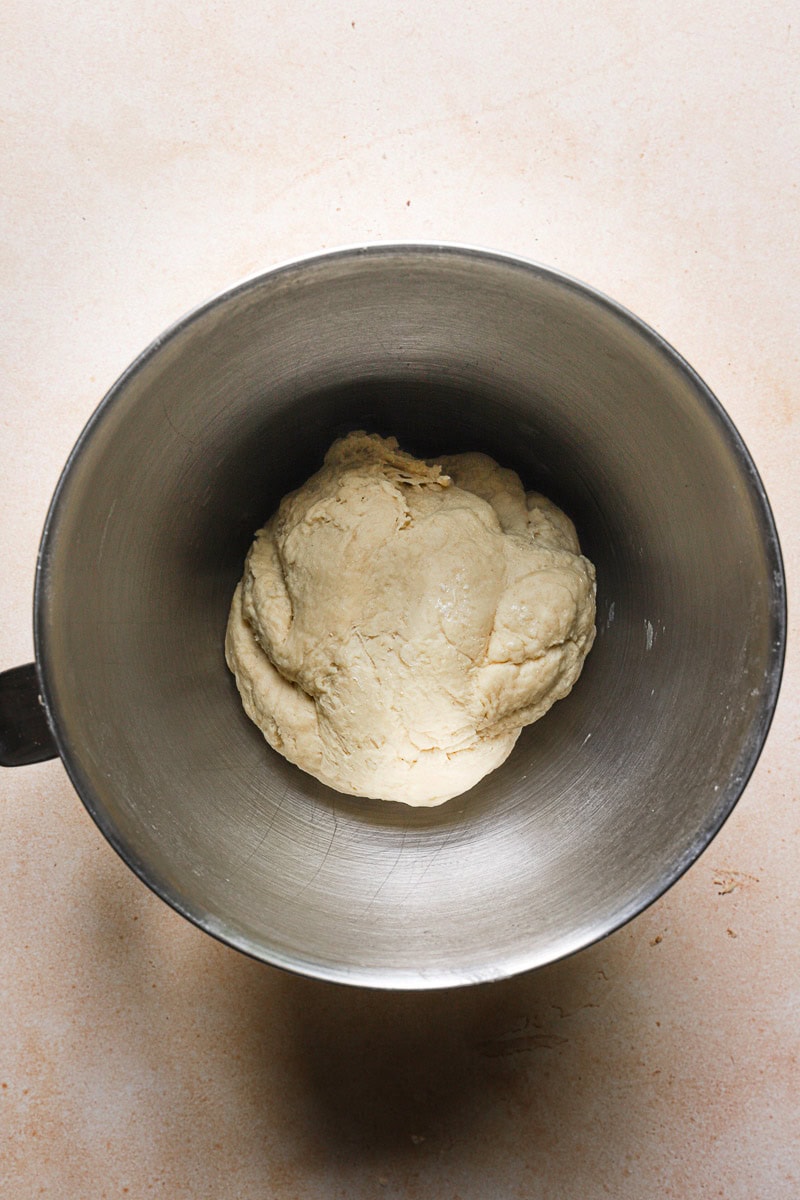 - Use the paddle attachment to mix the ingredients into a shaggy mass. Once the flour has been incorporated, replace it with the dough hook.