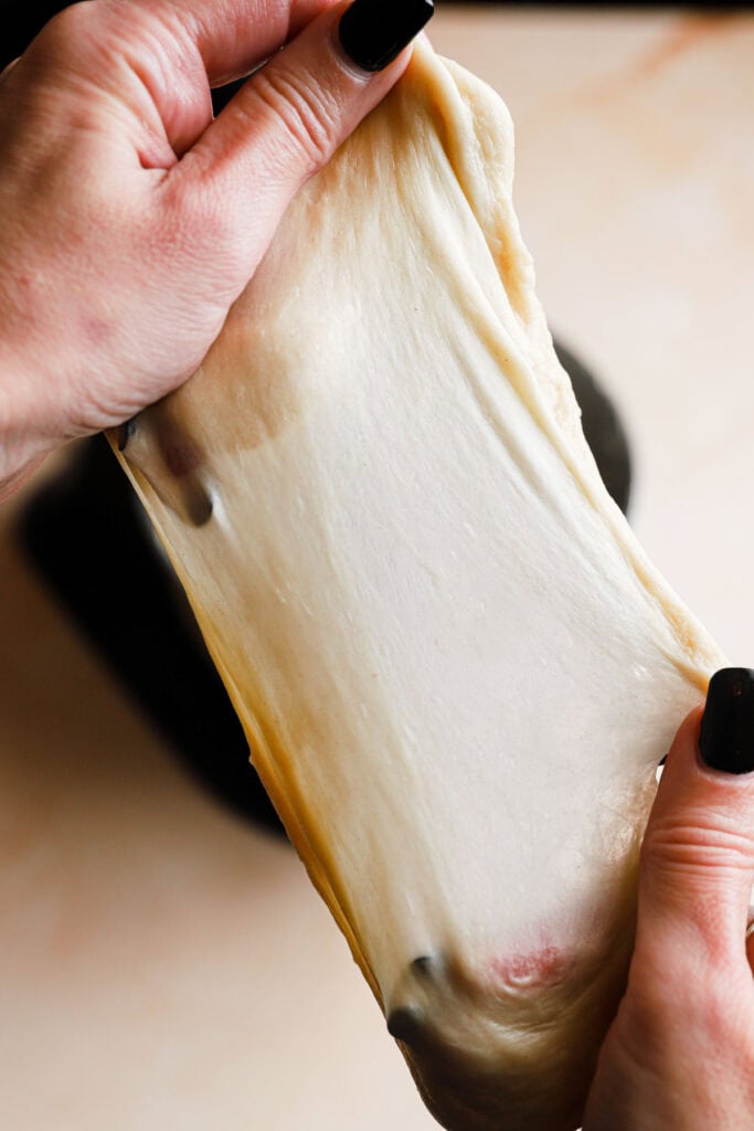 - Pay attention to the dough and not the timer: depending on the humidity in your kitchen, and the type of your mixer you may need any time between 10 to 20 minutes. The dough is ready when it clean the sides and bottom of the bowl and it stretches easily and creates a thin see though “window”.