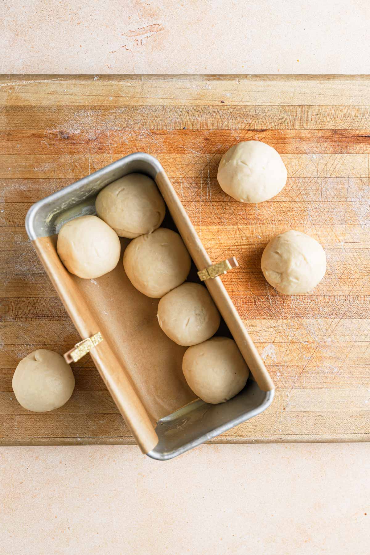 - Fold the top part towards the center, then the bottom over it. Gently lift the loaf and place it in an 9-inch pan lined with parchment paper, and grease on the sides.