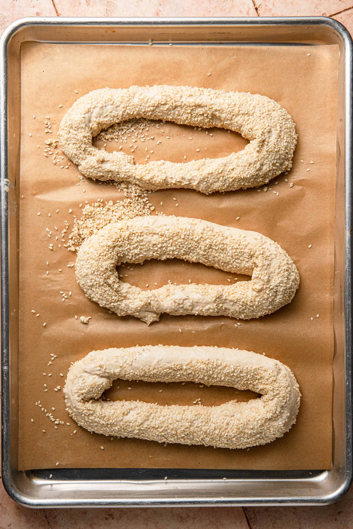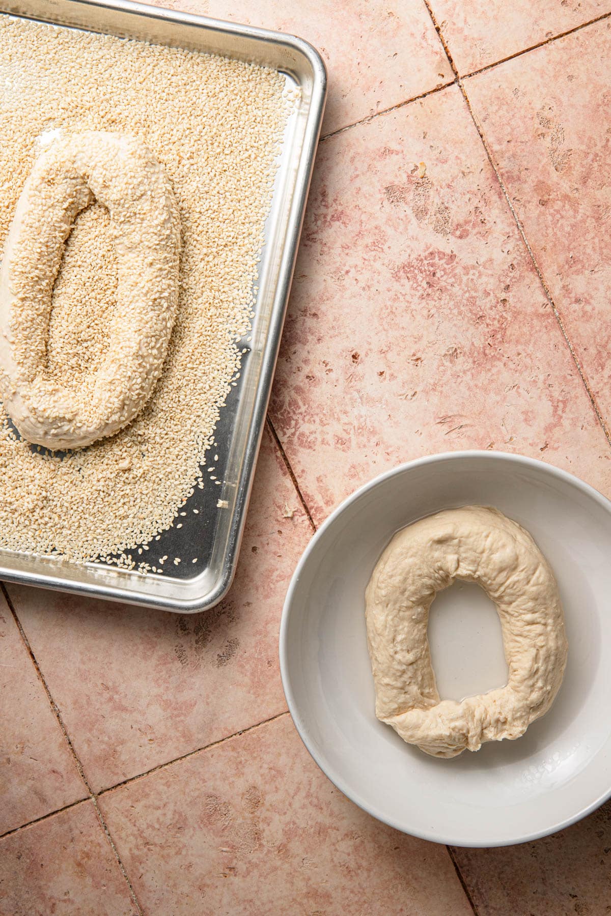 - Before shaping the dough, filled a wide bowl with the water, and a small cookie sheet with the sesame seeds. Line two large baking sheets with parc