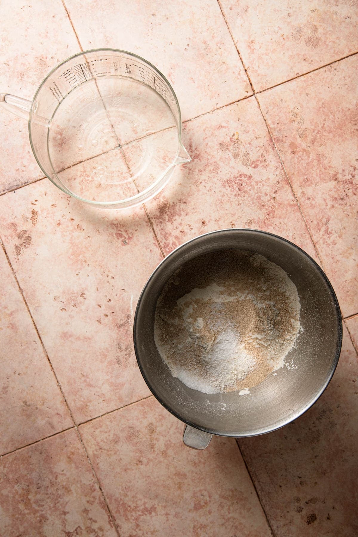- In a large bowl of a standing mixer measure the flour, sugar, salt and yeast.