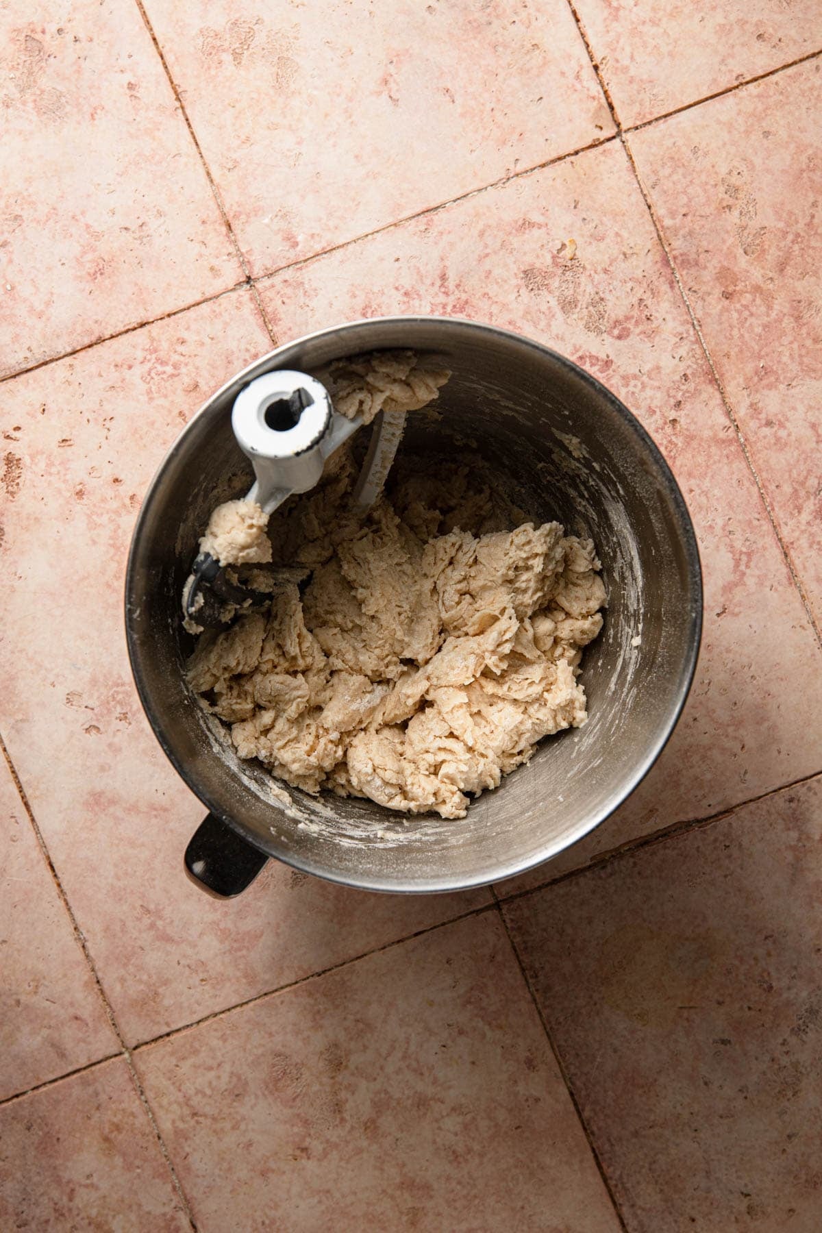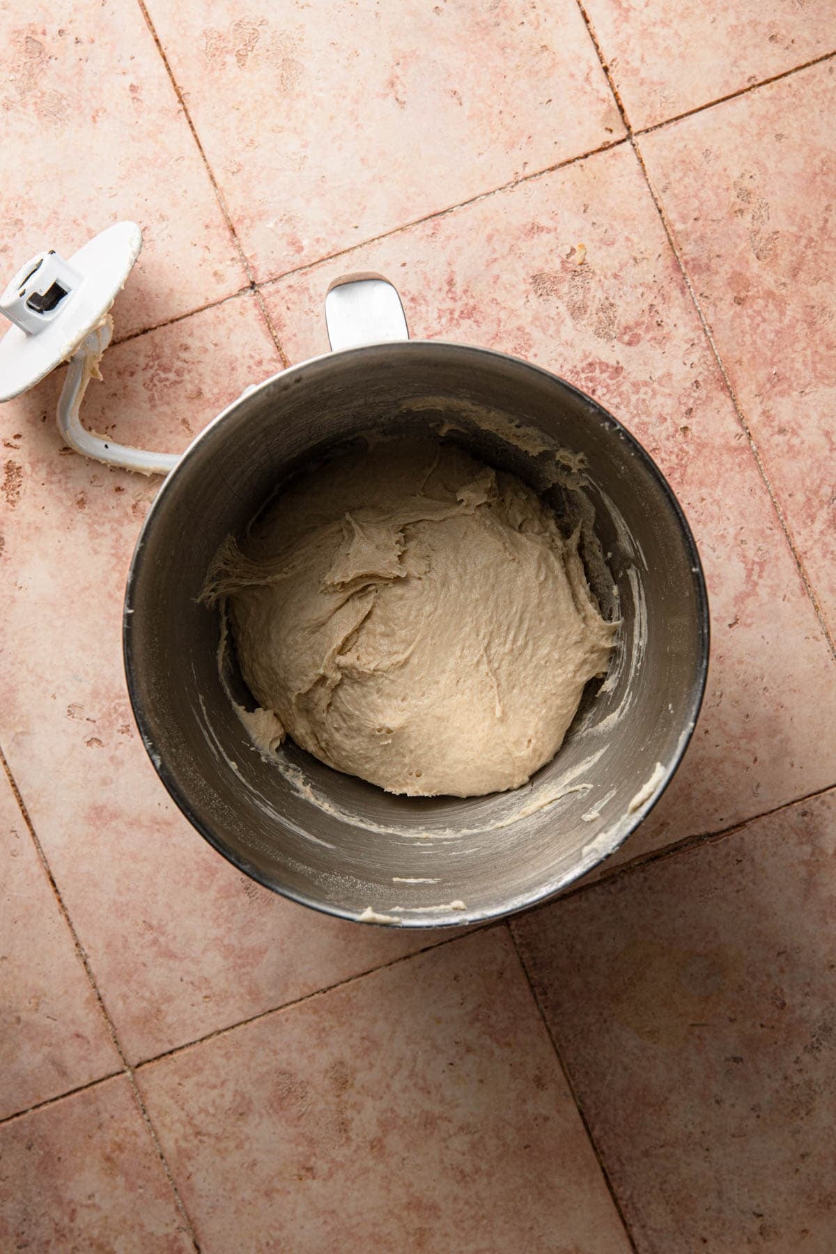 - Replace the paddle attachment with the dough hook attachment and mix on medium speed for about 5-7 minutes. Until you have a smooth dough, slightly sticky the cleans the sides of the bowl.