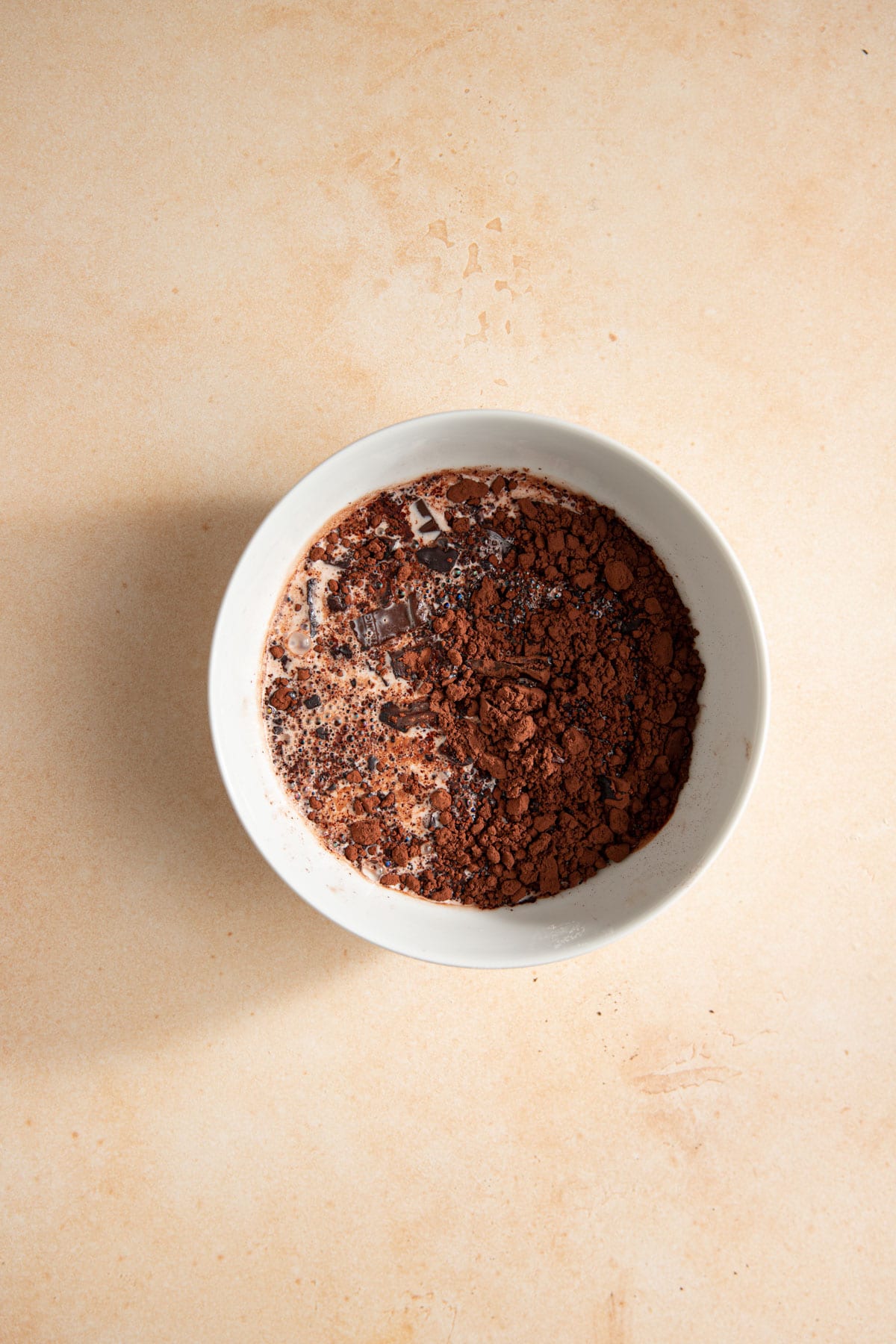 - Place the cocoa powder and chopped chocolate in a medium bowl and pour over the hot half and half. Let sit for about 4-5 minutes.