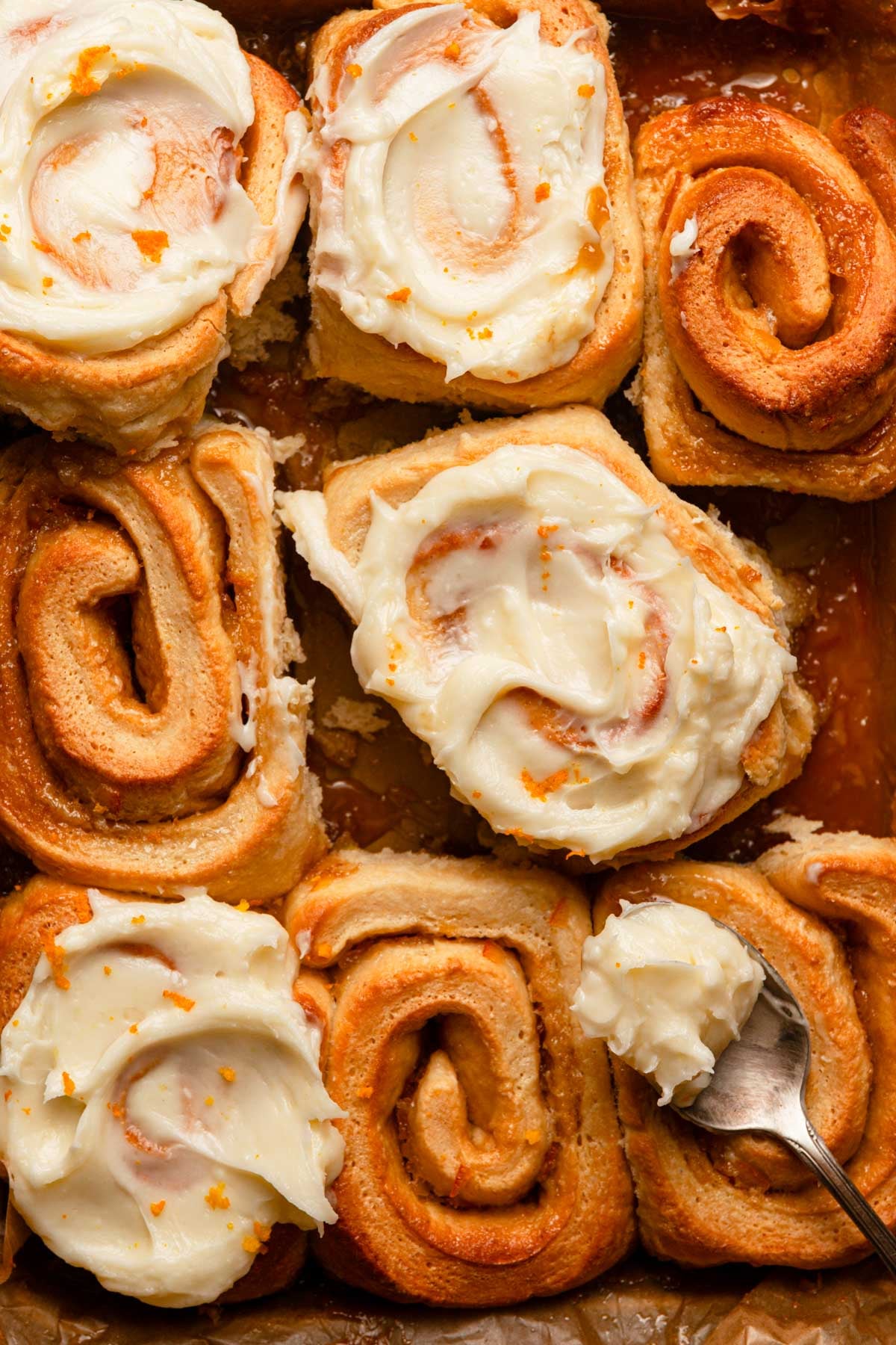 I took the classic sweet roll experience and gave it a bright, citrusy orange twist. These are not your typical orange rolls, it’s a fluffy, tender yeasted dough topped with creamy orange butter made from scratch, plus another layer of bright, tangy, slightly chewy orange marmalade. The rolls bake to golden perfection and are best with a generous portion of cream cheese frosting.