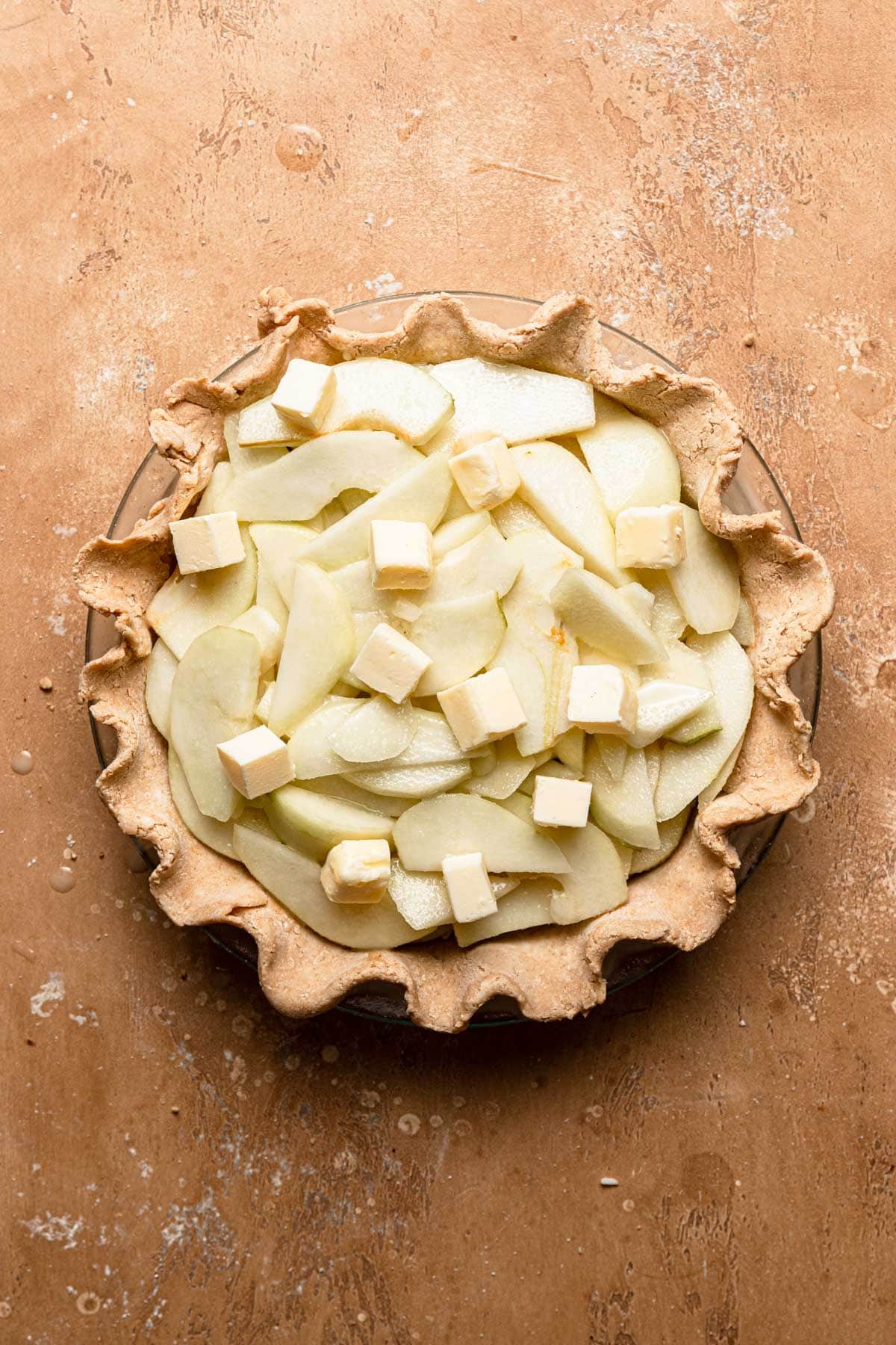 - Evenly line pear filling then dot with the cut butter and sprinkle with the streusel making sure to have some open spaces for the steam to evaporate from.