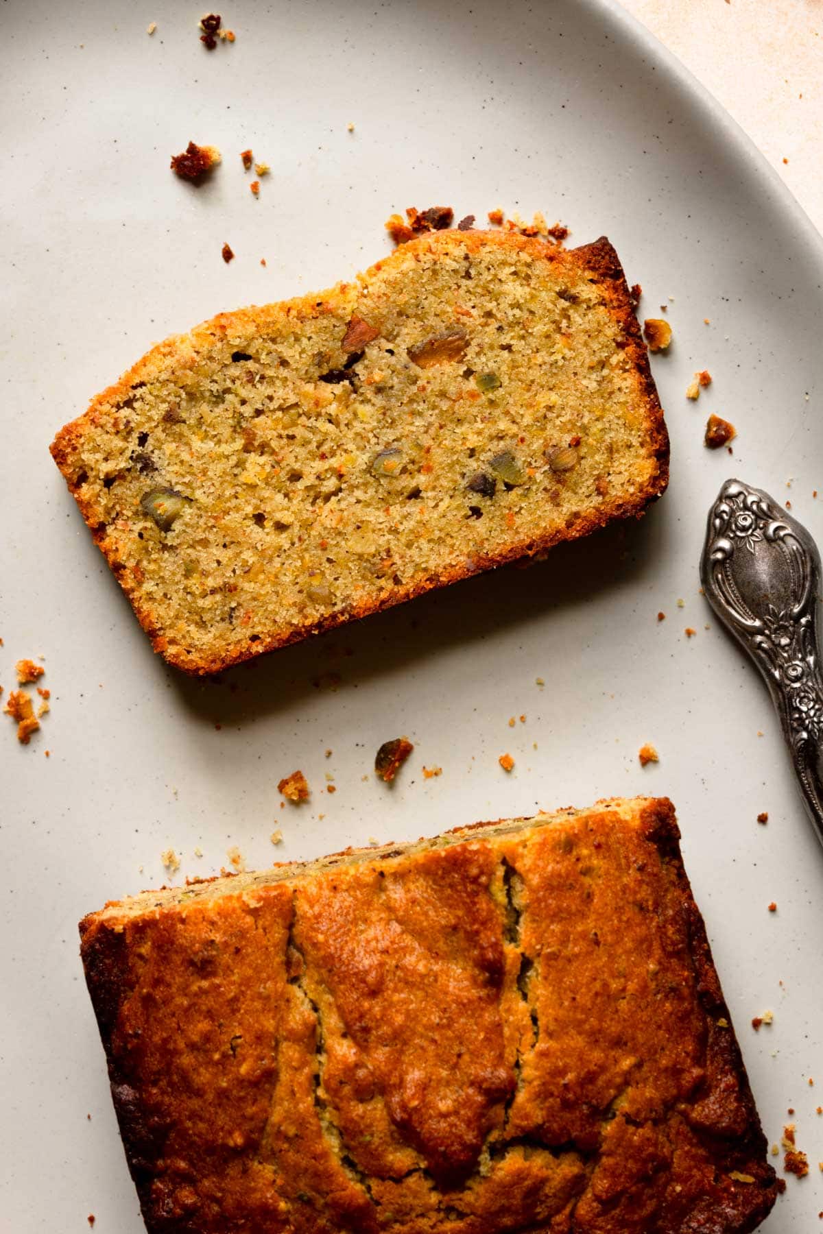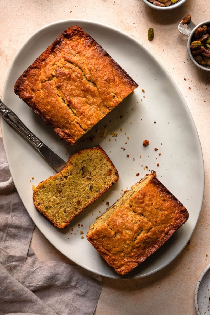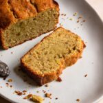 Moist, and tender pistachio bread dotted with crunchy pistachio bits makes for the a unique and distinctive combination of flavor and texture. In this recipe we are taking a few extra steps to release the pistachios special flavor and aroma, with the help of brown butter and cream cheese and without cake mix, or instant pudding mix.