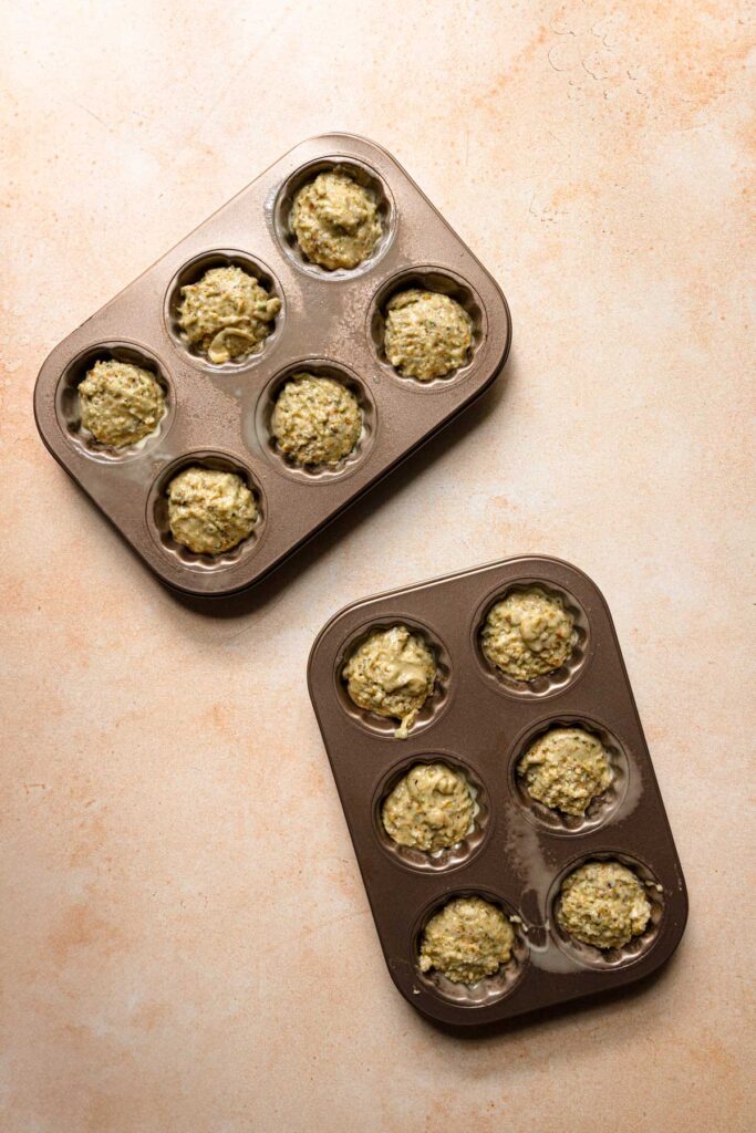- Grease a madeleine pan, or a mini cupcakes pan (total 12 cavities) and fill each mold 3/4 full.
