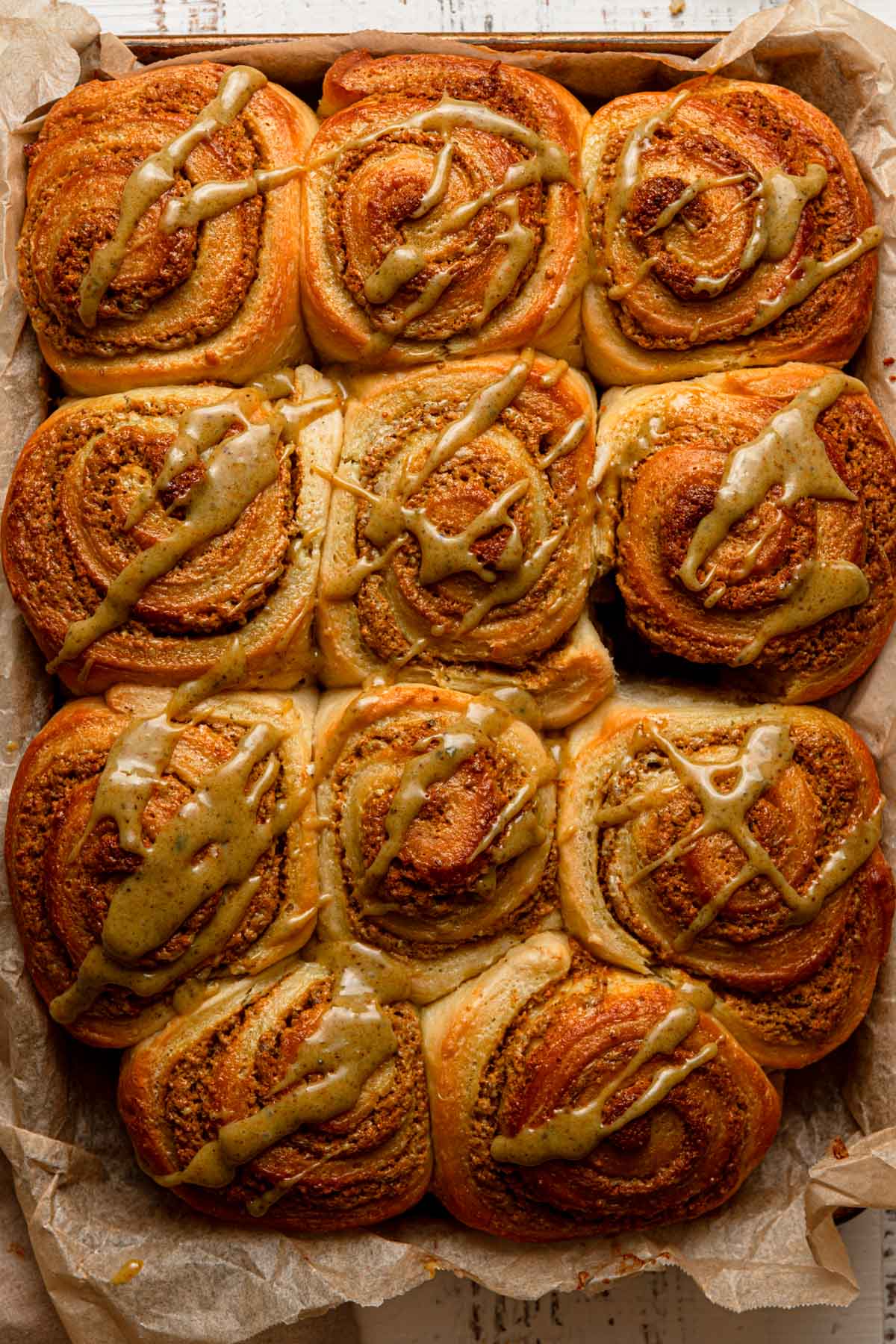 Like a cinnamon roll, but dressed in pistachio. Soft, fluffy swirls of sweet yeasted dough rolled up with a rich pistachio frangipane cream instead baked until golden brown. Familiar, comforting, and just different enough to feel special, this is the kind of roll that makes pistachio the main character.