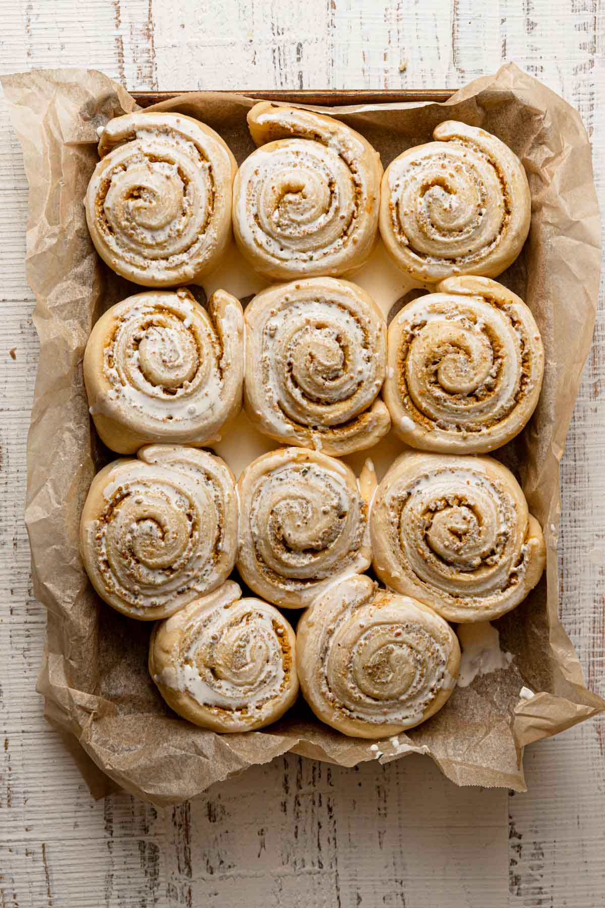 - Not a must, but brushing the rolls with heave cream and pouring some between the gaps will prevent the top of the rolls from drying out and give us a fluffier and softer pastries.