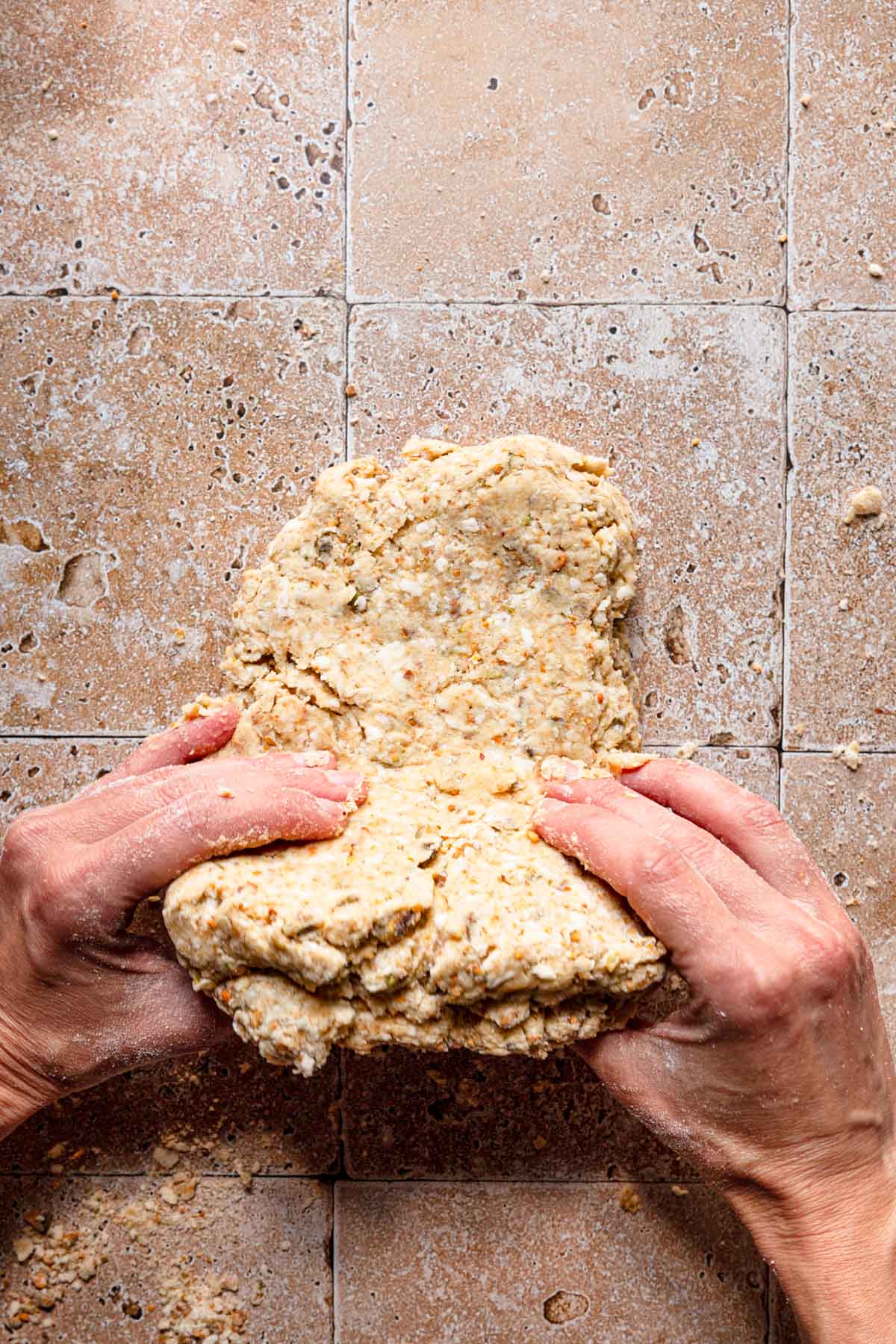 Because this dough is slightly drier than the classic scones, I like to fold it over itself press it twice.It brings the dough together, without the need to add more liquids, and creates flaky layers that bake into crispy pastry.