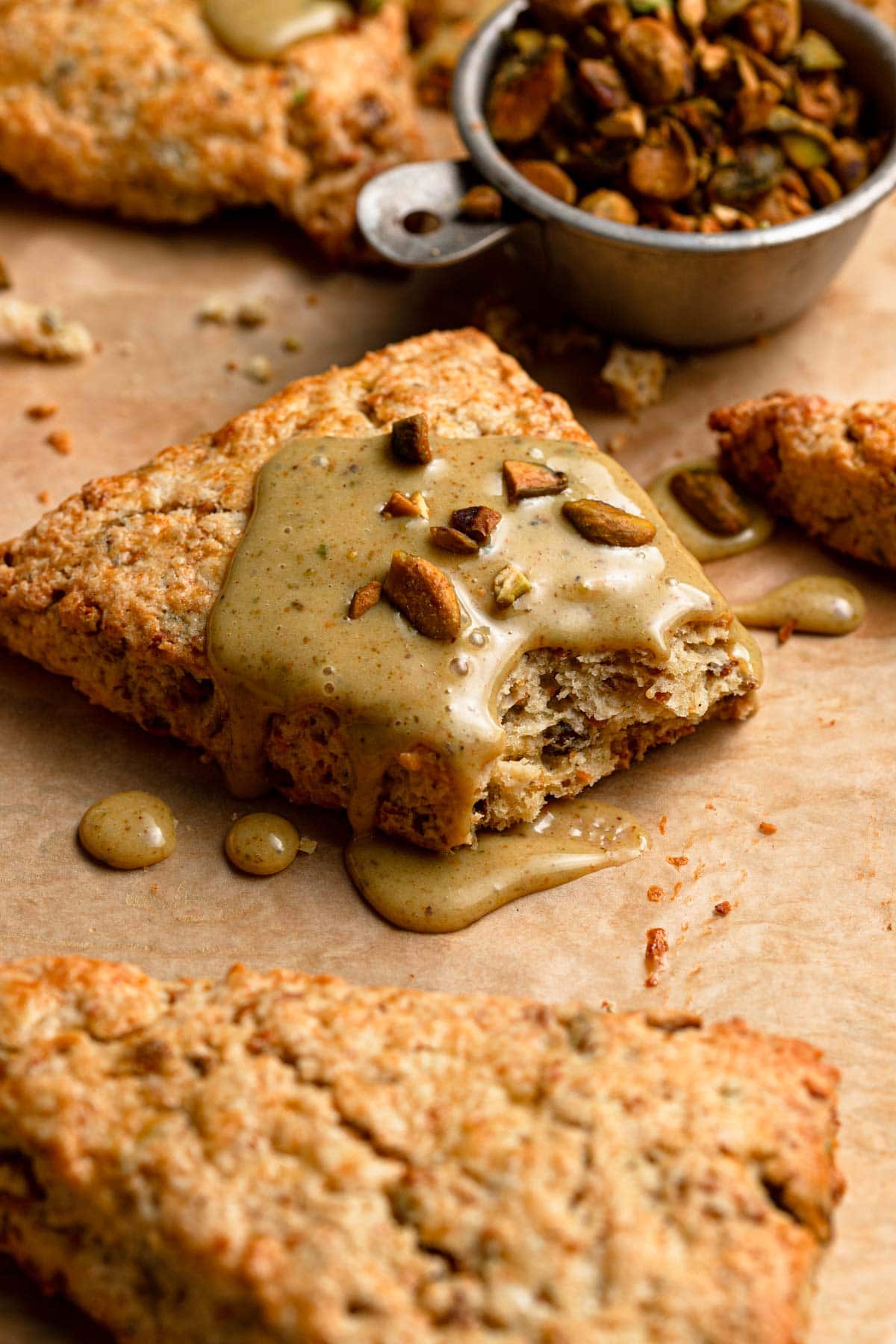 Buttery, golden brown pistachio scones with a scrip edges and a tender bite are a the perfect comfort bake. Slightly sweet, and loaded with pistachio flavor, they are easy to make and adjust for personal preference.