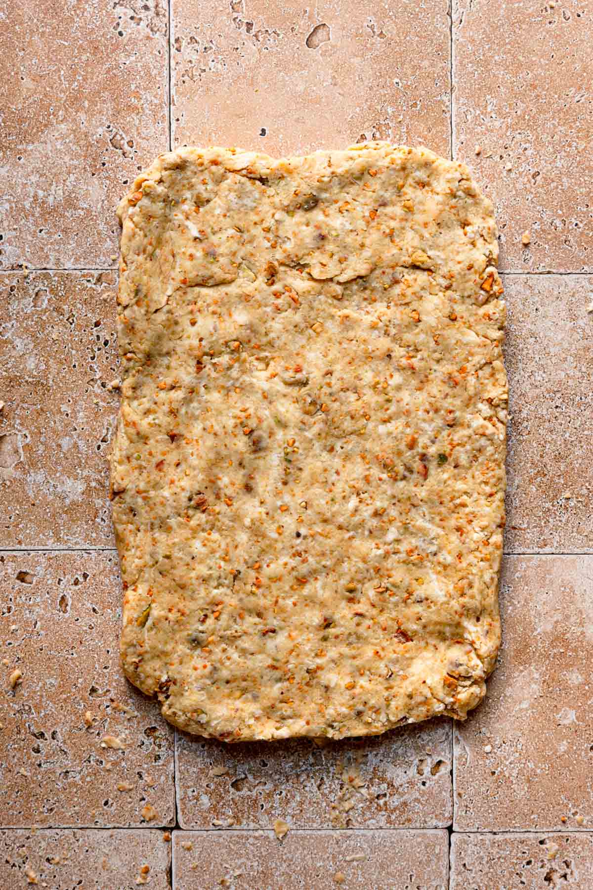 - Drop the mixture over a clean work surface and use your hands to press it into a rectangle dough. About 6×8-inches.