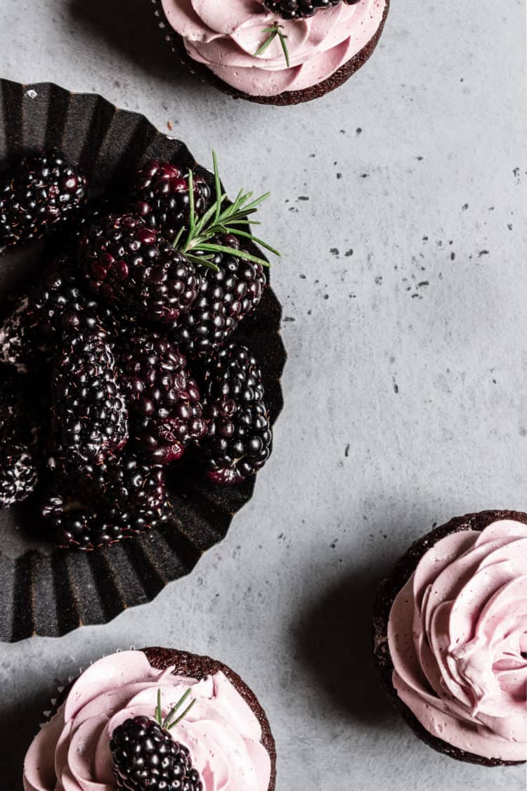 Chocolate Rosemary Cupcakes with Blackberries Buttercream