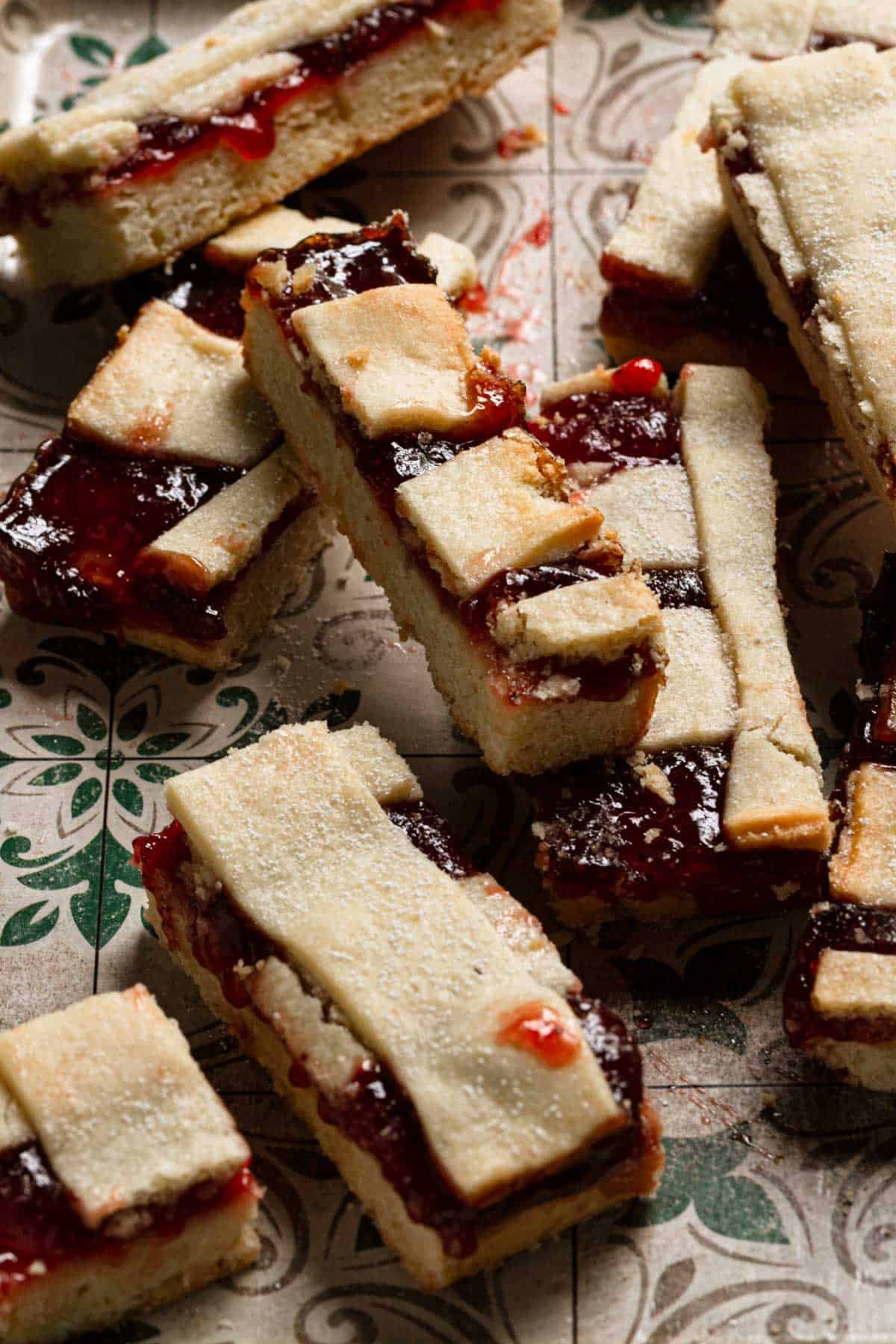 This easy recipe is a childhood favorite and a cross between two other recipes: the dough from my Strawberry jam cookies, and the baking technique from my mom’s apple cake. It’s a unique combination of crumbly dough topped sweet, slight chewy and filling and it all comes together by another layer of shortbread. You probably already tried this recipe, as it is known by most as strawberry crumble bars, but I went with a lattice top instead of the crumble topping, like my mom used to do.
